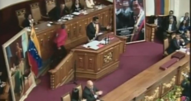Ο νεοεκλεγείς πρόεδρος της Βενεζουέλας Νικολάς Μαδούρο αναγκάστηκε να διακόψει την ομιλία του μετά την ορκωμοσία του στο κοινοβούλιο της χώρας, όταν ένας άνδρας όρμησε στην εξέδρα και του άρπαξε το μικρόφωνο.