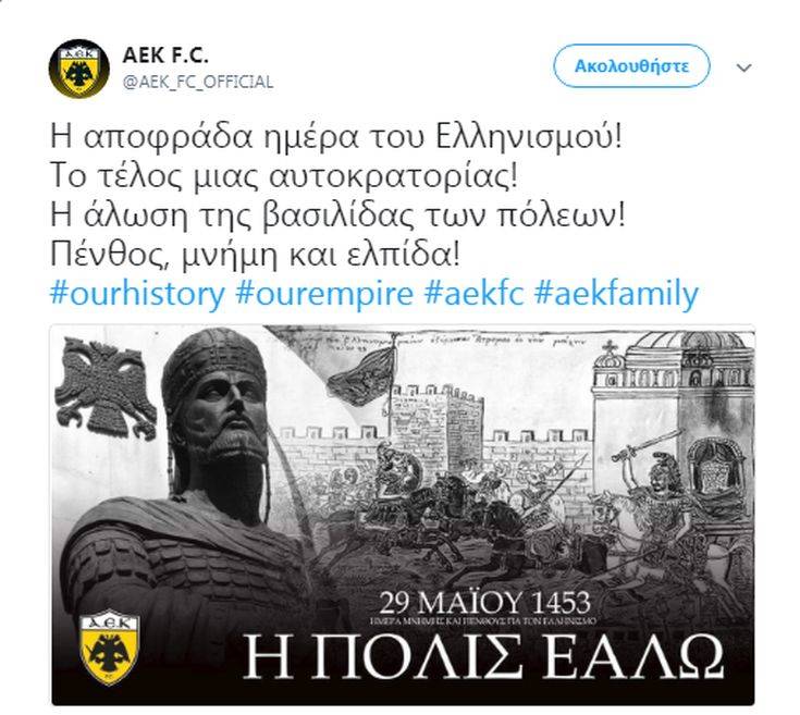 «Η αποφράδα ημέρα του Ελληνισμού! Το τέλος μιας αυτοκρατορίας! Η άλωση της βασιλίδας των πόλεων! Πένθος, μνήμη και ελπίδα! Η ιστορία δεν έχει τέλος. Μόνο αρχή!..», αναφέρει το σχετικό μήνυμα.