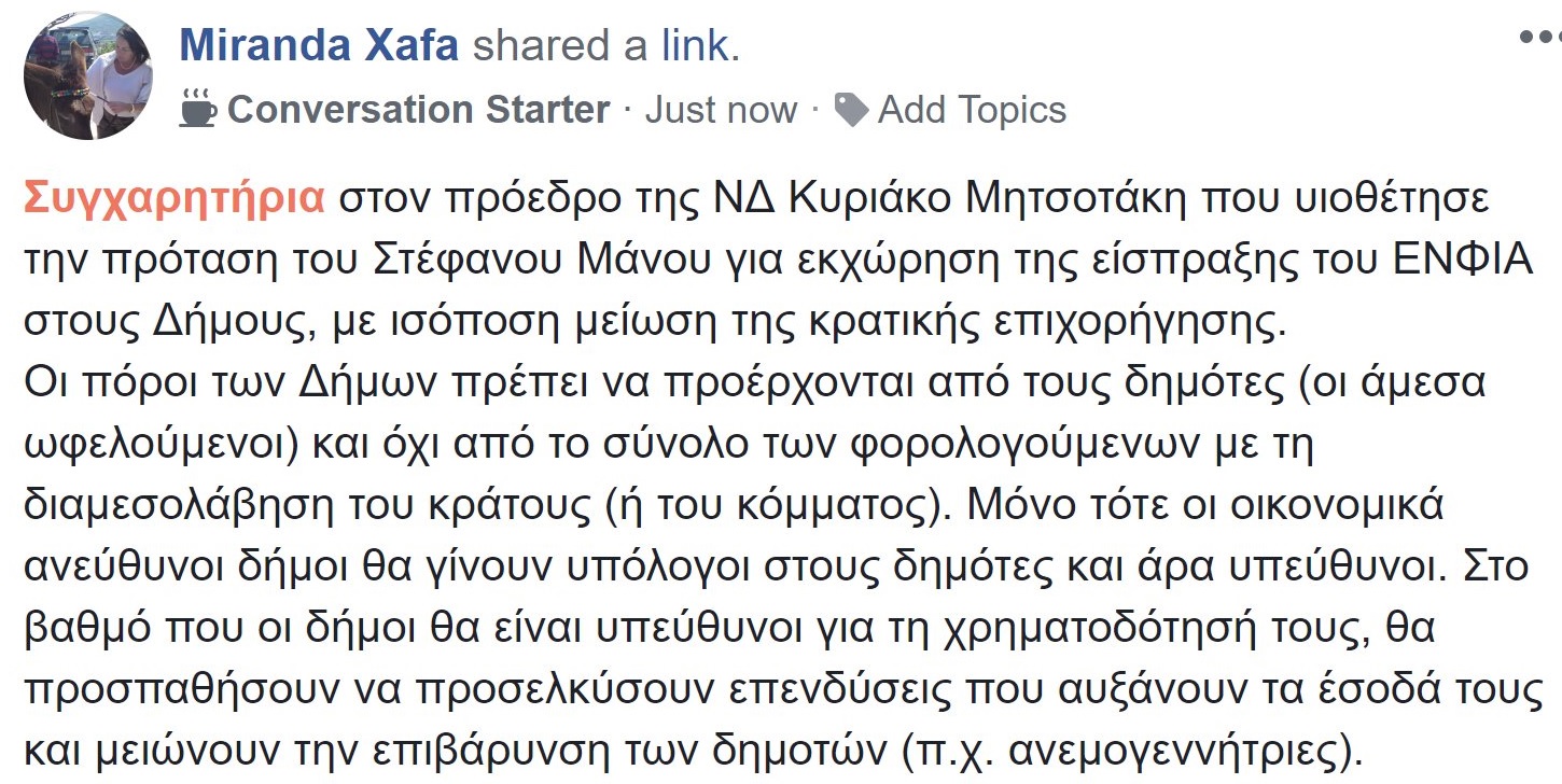 Με ανάρτησή της στο Facebook η πρώην εκπρόσωπος του ΔΝΤ και μυστικοσύμβουλος του κ. Μητσοτάκη, η οποία πριν λίγες ημέρες παραπονιόταν γιατί της ήρθε αυξημένος ο ΕΝΦΙΑ για το διαμέρισμά της στο Κολωνάκι, συγχαίρει τον Πρόεδρο της ΝΔ για αυτή του την επιλογή, επιβεβαιώνοντας με αυτόν τον τρόπο πως όντως πρόκειται για πρόταση που είχε καταθέσει η Δράση του Θ. Σκυλακάκη και του Στέφανου Μάνου ήδη από το 2014!