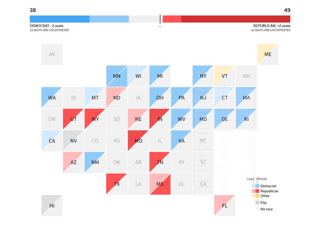 Οι Ρεπουμπλικάνοι διατηρούν την πλειοψηφία στη Γερουσία και με βάση τα μέχρι στιγμής επίσημα αποτελέσματα λαμβάνουν 49 έδρες έναντι 38 των Δημοκρατικών.