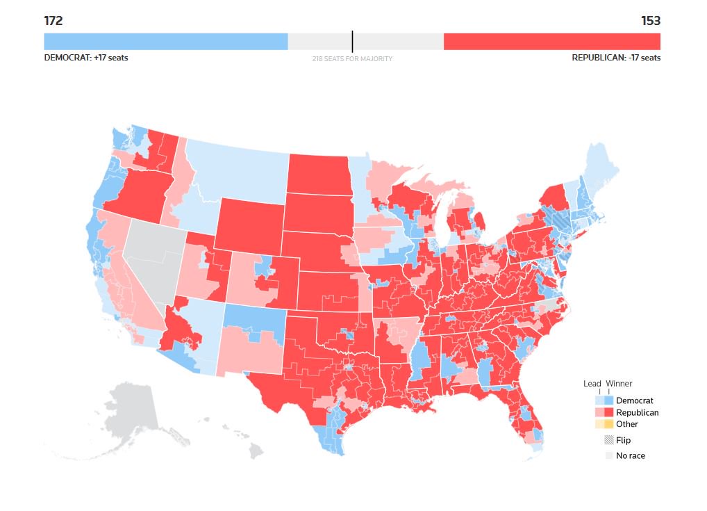 Ωστόσο, χάνουν τη Βουλή των Αντιπροσώπων, την οποία επανακτούν ύστερα από 8 χρόνια οι Δημοκρατικοί (προηγούνται με 172 έδρες έναντι 153 των Ρεπουμπλικάνων), κάτι που θα τους δώσει τη δυνατότητα να μπλοκάρουν την ατζέντα του Trump και να θέσουν υπό εντατικό έλεγχο τη διακυβέρνηση του.