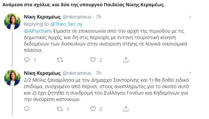 Επανήλθε, δε, λέγοντας: «Μόλις ξαναμίλησα με τον δήμαρχο Σαντορίνης και 1) θα δοθεί ειδικό επίδομα, ενισχυμένο από πέρυσι, στους αναπληρωτές για τον σκοπό αυτό και 2) έχει ζητηθεί η συνδρομή του Συλλόγου Γονέων και Κηδεμόνων για την ανέρευση κατοικιών».