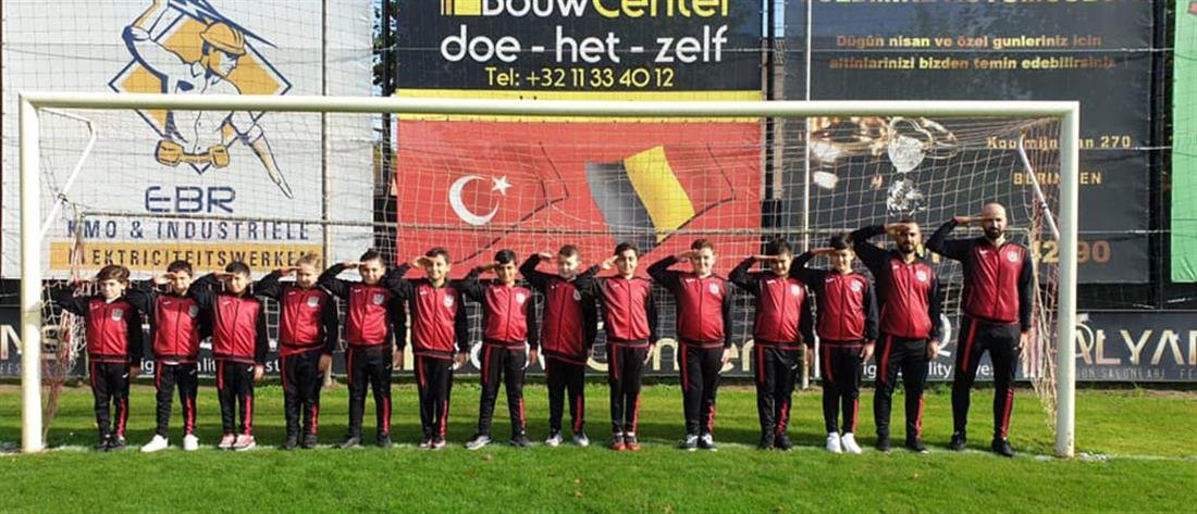 Στη φωτογραφία κάτω παιδική ποδοσφαιρική ομάδα παιδιών Τούρκων μεταναστών στο Βέλγιο, χαιρετά στρατιωτικά, για να στηρίξει την βάρβαρη εισβολή της Τουρκίας στη ΒΑ Συρία.