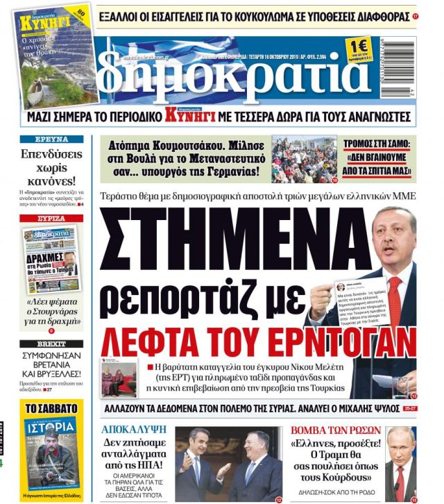 Την ώρα που ο τουρκικός στρατός βομβαρδίζει και σφάζει τους Κούρδους, μεταξύ των οποίων αμάχους και γυναικόπαιδα αλλά και ο Ρετζέπ Ταγίπ Ερντογάν εισβάλει στην κυπριακή ΑΟΖ και απειλεί στο Αιγαίο, ένα πολύ μεγάλο θέμα για την αξιοπιστία, εφ’ όσον βέβαια επαληθευτεί, ορισμένων ελληνικών ΜΜΕ αναδεικνύεται από τον Τύπο.