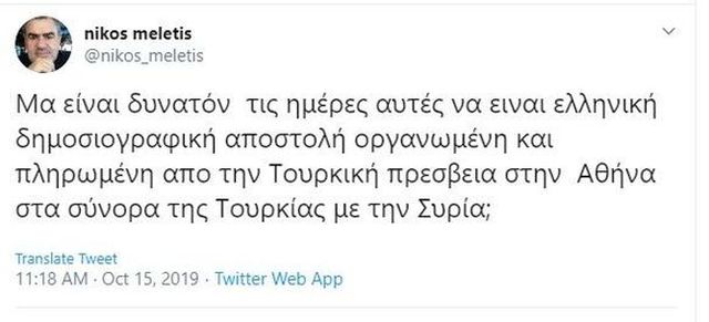 Ο Ν. Μελέτης αναφέρει στο tweet του: «μα είναι δυνατόν τις ημέρες αυτές να είναι ελληνική δημοσιογραφική αποστολή οργανωμένη και πληρωμένη από την τουρκική πρεσβεία στην Αθήνα στα σύνορα της Τουρκίας με τη Συρία;»