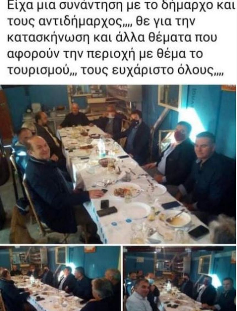 Οργή έχει προκαλέσει στην τοπική κοινωνία του Πύργου μία φωτογραφία που «ανέβηκε» πριν από λίγο στα μέσα κοινωνικής δικτύωσης, στην οποία απεικονίζονται ο Δήμαρχος και οι Αντιδήμαρχοι της περιοχής σε… τραπέζωμα με τουλάχιστον 12 άτομα!Σύμφωνα με πληροφορίες από το ilialive.gr, στην επίμαχη φωτογραφία διακρίνονται ο δήμαρχος Πύργου, Τάκης Αντωνακόπουλος, ο αντιδήμαρχος Νίκος Κοτσώνης, ο αντιδήμαρχος Μαρίνης Αχτύπης, ο γενικός γραμματέας του δήμου Γιάννης Βαρελάς, ο αντιπρόεδρος της ΔΕΥΑΠ Γιώργος Καραστέργιος κι αρκετά ακόμα πρόσωπα που δεν φορούσαν μάσκα.