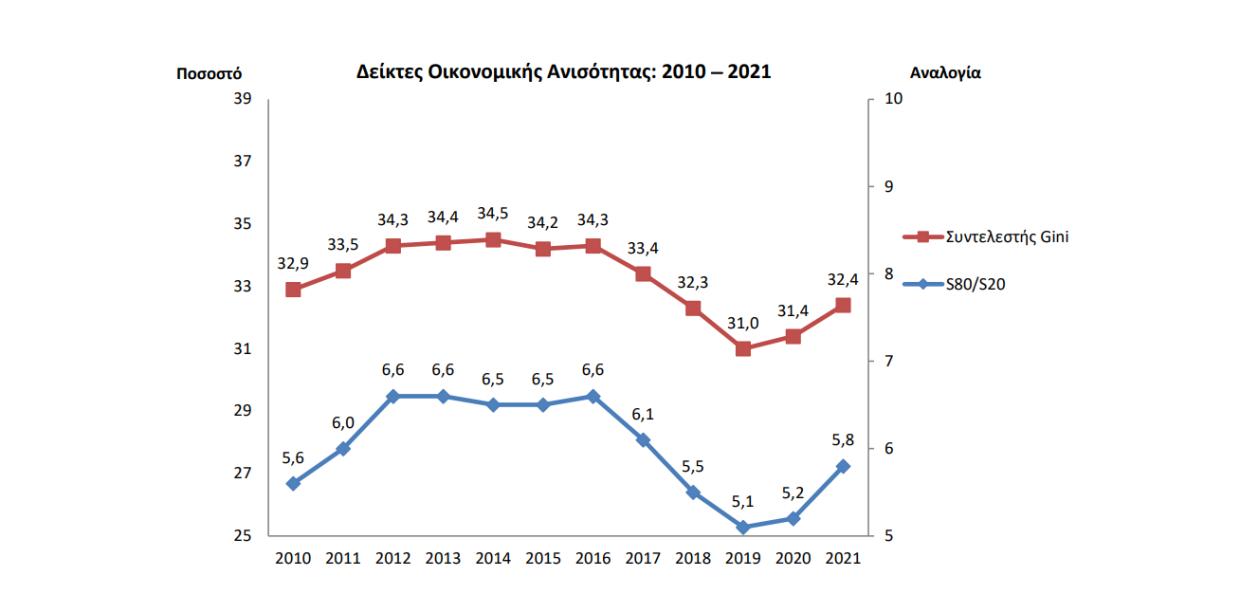 Πέρυσι (εισοδήματα 2020), σύμφωνα με την ΕΛΣΤΑΤ, το 28,3% του πληθυσμού της χώρας (2.971.200 άτομα) βρίσκονταν σε κίνδυνο φτώχειας ή κοινωνικό αποκλεισμό, παρουσιάζοντας αύξηση κατά 0,9% σε σχέση με το 2020.