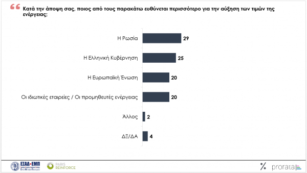 Σύμφωνα με τις απαντήσεις που δίνουν κατά σειρά των ποσοστών των απαντήσεων που έδωσαν σε συγκεκριμένες επιλογές είναι: Η Ρωσία, η ελληνική κυβέρνηση, η Ευρωπαϊκή Ένωση και οι ιδιωτικές εταιρείες/προμηθευτές ενέργειας