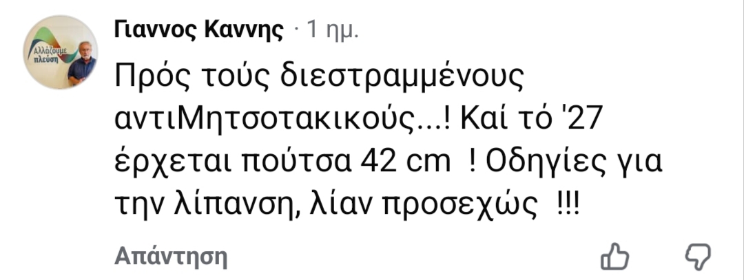 Ο κ. Κάννης στα σχόλια της ανάρτησης ανέφερε χαρακτηριστικά: “Πρός τούς διεστραμμένους αντιΜητσοτακικούς…! Καί τό ’27 έρχεται π@ύτσα 42 cm ! Οδηγίες για την λίπανση, λίαν προσεχώς !!!”